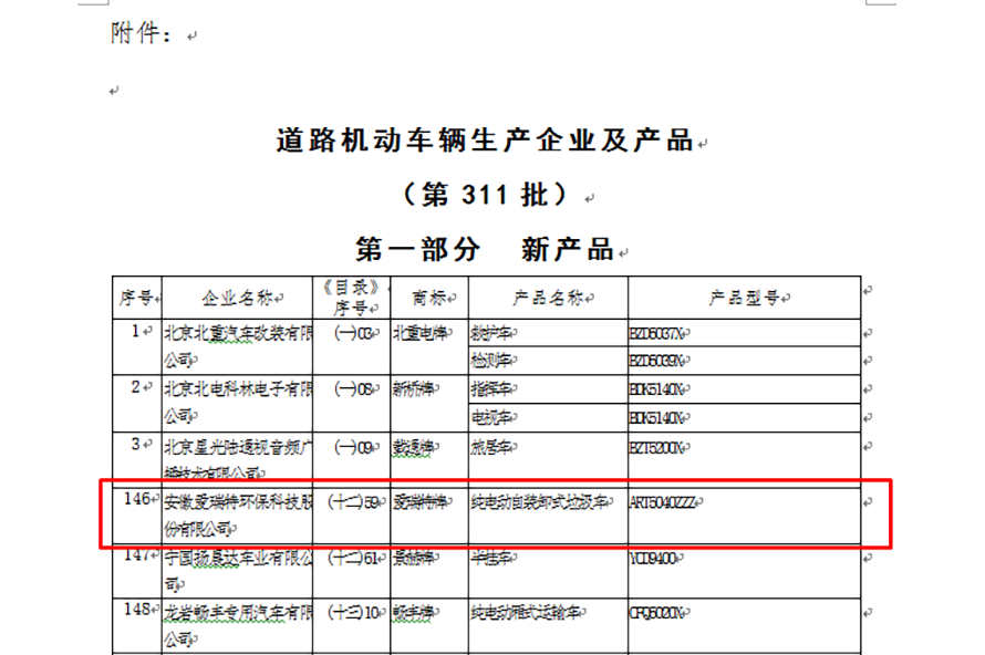愛瑞特于2017年12月4日正式通過中華人民共和國工業和信息化部公布的道路機動車輛生產企業及產品(第302批)公告,正式獲得汽車產品生產及銷售許可;2018年9月6日“愛瑞特”牌ART5040ZZZY50BEV型純電動自裝卸式垃圾車正式列入工信部產品公告目錄(第311批)。