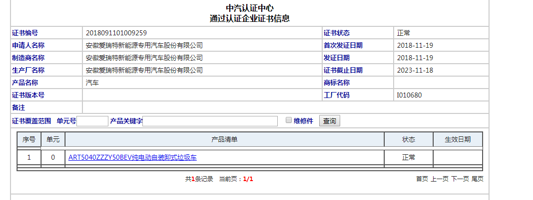 近期,經中汽認證中心認證,安徽愛瑞特新能源專用汽車股份有限公司(以下簡稱愛瑞特)旗下ART5040ZZZY50BEV車型通過強制性產品認證,即國家3C認證,取得了該領域市場的準入資格。這標志著愛瑞特研發(fā)的新能源環(huán)衛(wèi)專用汽車在新能源汽車行業(yè)前進了一大步,正式邁入批量生產、投放市場階段。ART5040ZZZY50BEV型純電動自裝卸式垃圾車節(jié)能減排、經濟實用、操控簡單,起步快行駛穩(wěn)定,噪音低安全性高,既為城市垃圾清潔行業(yè)降低了運營成本,又減少了城市空氣污染指數;既提升了城市居民的生活質量,又推進了綠色城市的健康建設。